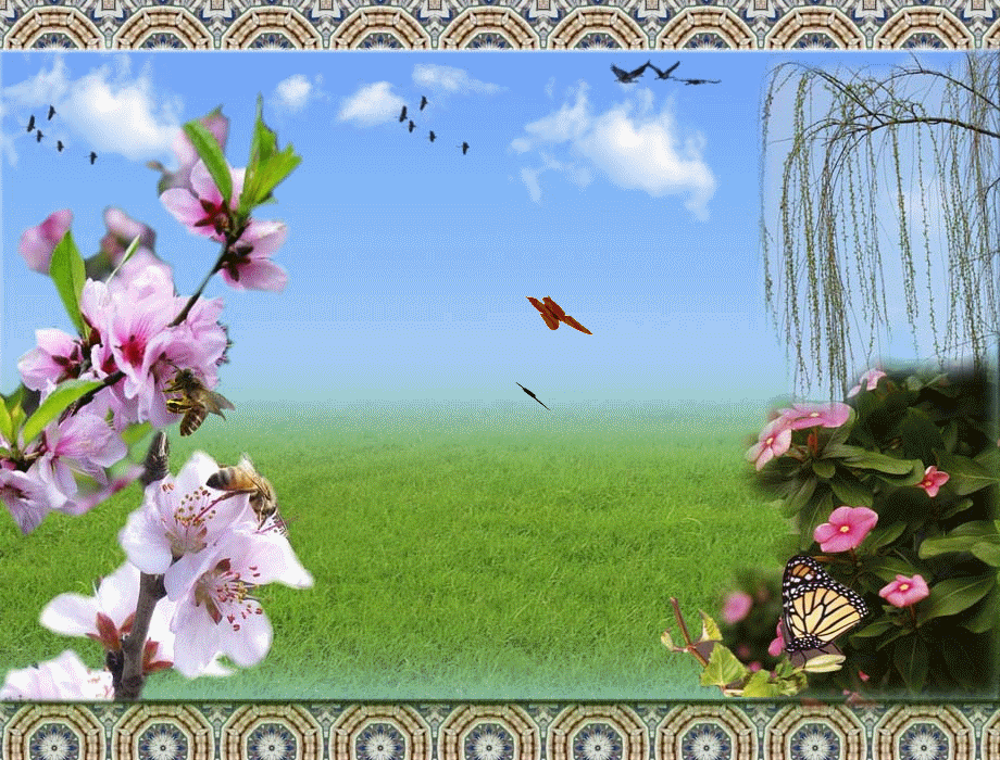 又逢三月艳,桃红李白,谁与争先?油菜花,八方灿灿忧缘。芍药海棠献媚,蜂蝶舞、雏燕翩翩。蛙声鼓,江河润笔,墨绿意春天。