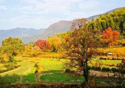 晨起踏步朝阳沐。清风林荫浴。鸟唱碧枝间,鸡啄丛虫,花艳民家屋。