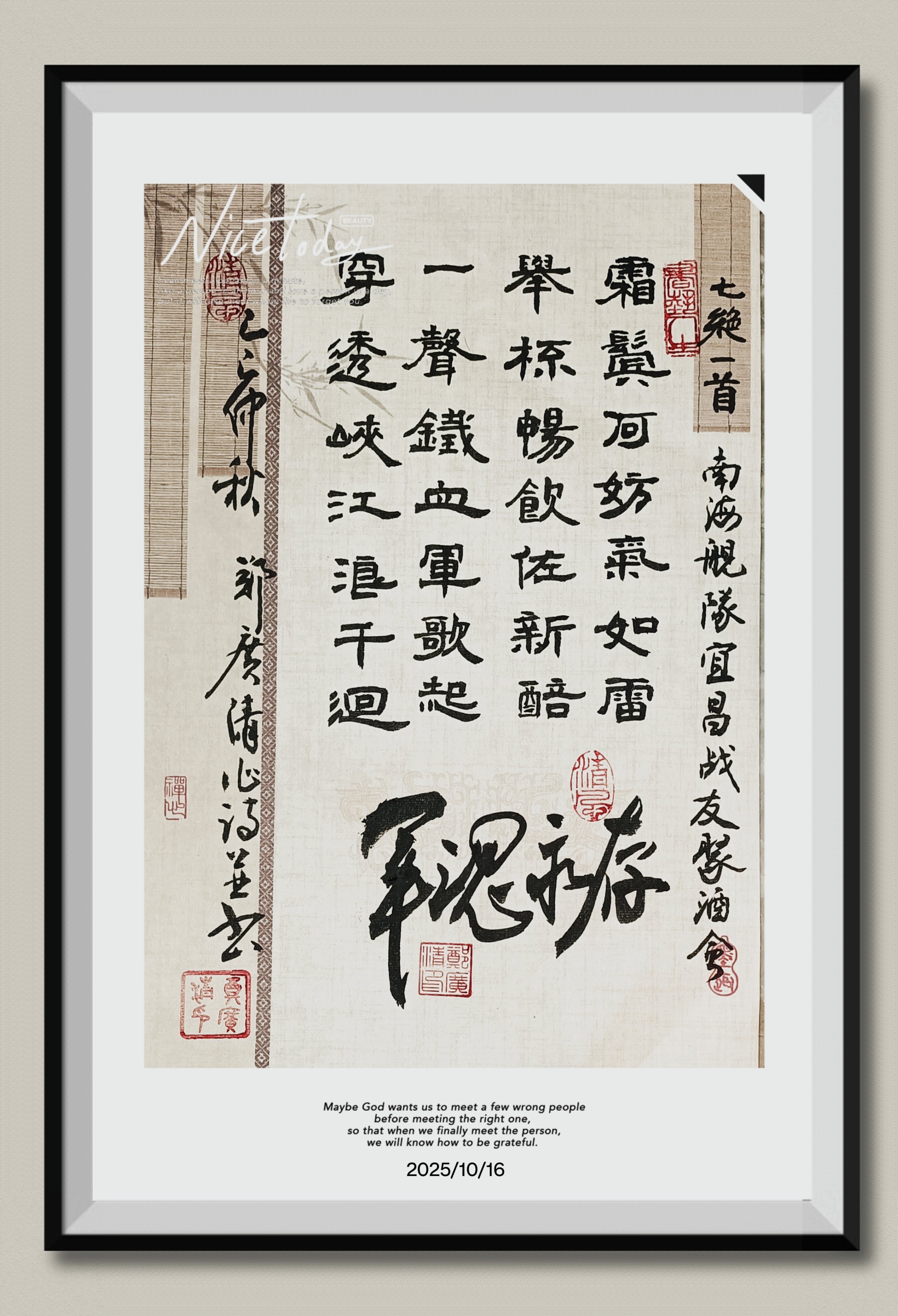 华夏军旅雄豪,战旗红猎猎,金瓯如铁。机鑑巡航,弹指处、狂虏灰飞烟灭。北斗新星,髙天远望尽,隐形妖孽。和平心愿,五洲同享凉热。