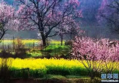 桃花競放枝间卧,芳香千里江州。游来客往匆忙,妩媚人间秀、醉消愁。雨润春耕解百忧。