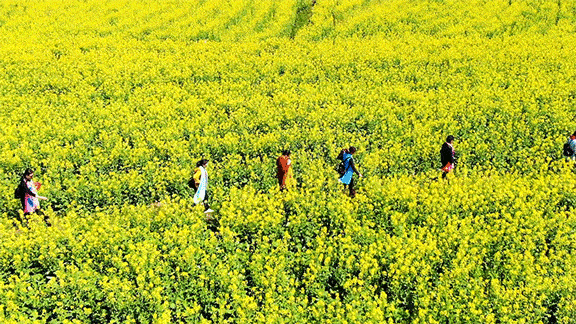 张池故陌,农耕画景,都付诗行。节启芳年,千万顷、浪涛如海,潮撼荆襄。游人笑语,趁惠风、情入村乡。更祝取、愿沙洋岁岁,春心永驻、鸿运无疆。